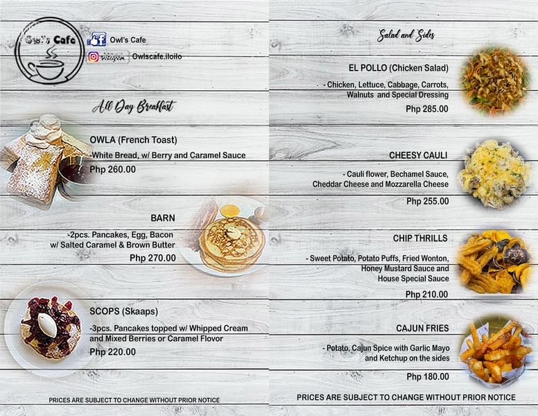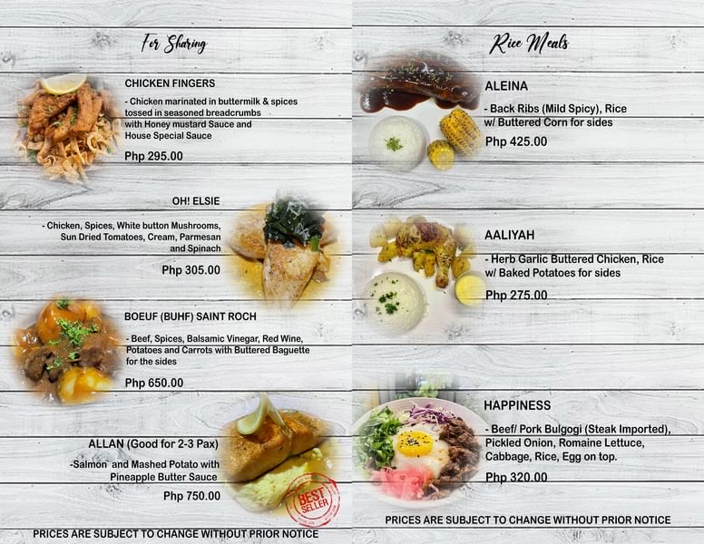 The menu features a variety of food and beverage options suitable for casual dining and light meals throughout the day. Visitors can expect offerings that include hot and iced coffee drinks as well as other beverages. The food selection consists of substantial portions covering rice meals, pasta dishes, salads, burgers, and finger foods. Portions tend to be generous, making many items appropriate for sharing or for a more filling meal.